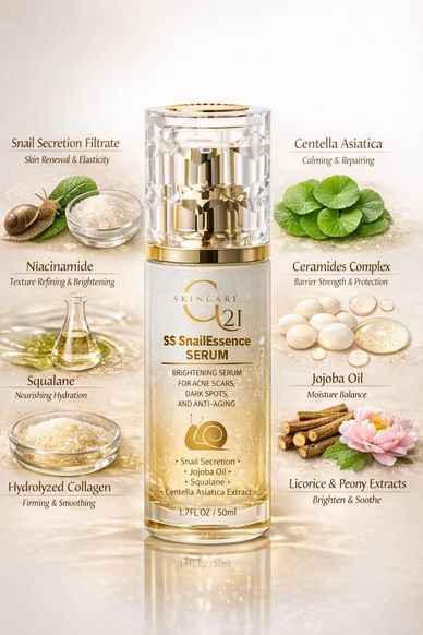 A luxurious, lightweight serum enriched with Snail Secretion Filtrate, Centella Asiatica, and Niacinamide to rejuvenate skin, reduce hyperpigmentation, and improve texture. It hydrates deeply, promotes healing, and evens skin tone, leaving your complexion youthful, smooth, and radiant.